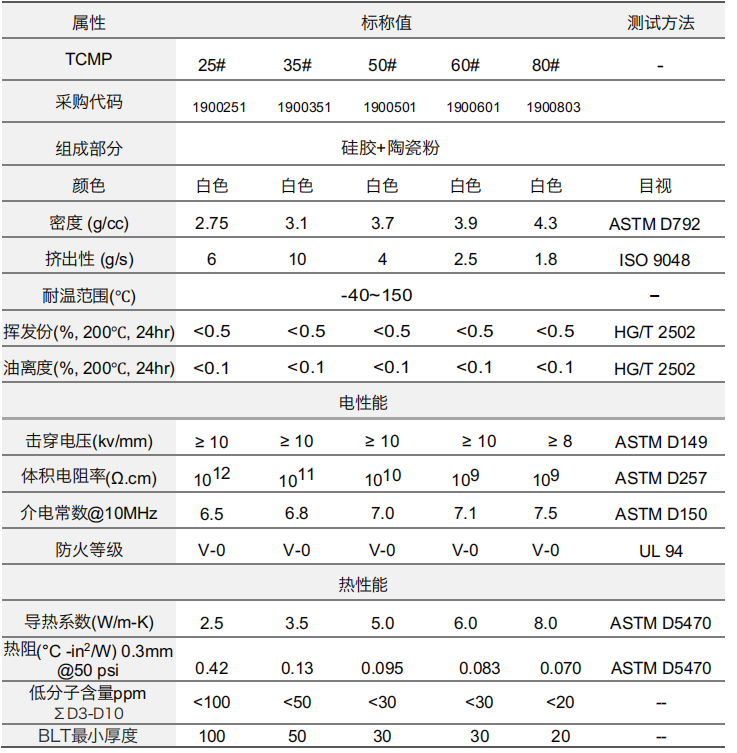 TCMP导热凝胶是一种可塑性很强的硅胶导热产品,根据客户使用可选择不同2.0~8.0w导热系数的产品, 导热泥状,不流淌,不 分层,具有良好的界面润湿性,最小压平间隙的厚度可达0.12mm, 应用工艺可根据客户的需要制作成高压缩率的片状 产品或手捏橡胶泥的状态, 具有高效的导热效果和优异的填缝效果。
